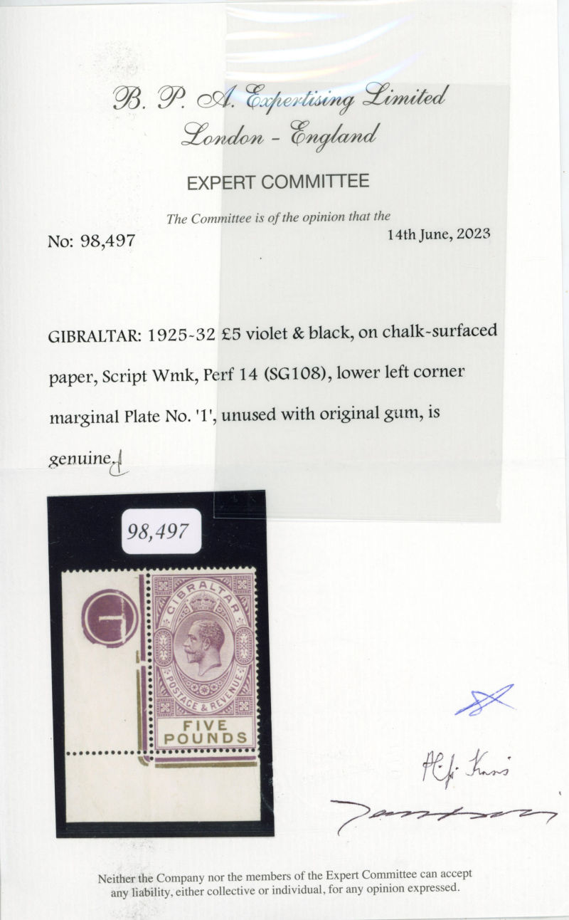 1925-32 £5 violet and black lower left corner example with Plate 1, unmounted o.g. Very fine, desirable in this form. BPA Certificate (2023). SG 108, £1600