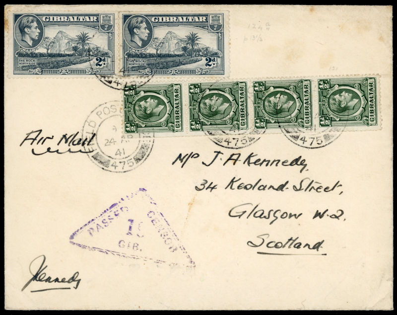 censored envelope to Glasgow with ½d vertical strip of four and 2d perf 13½ horizontal pair, both ex coils, FPO 475 CDSs of 24 AP. the envelope with slight staining and backflap torn across, still scarce and certainly unusual. SG 121, 124a (Image) (Image2)