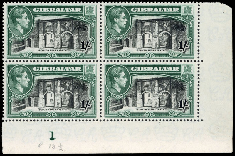 1938-42 1/- perf 13½ lower right corner block of four with Frame Plate 1, unmounted o.g., fine. SG 127a, £300 (Image)