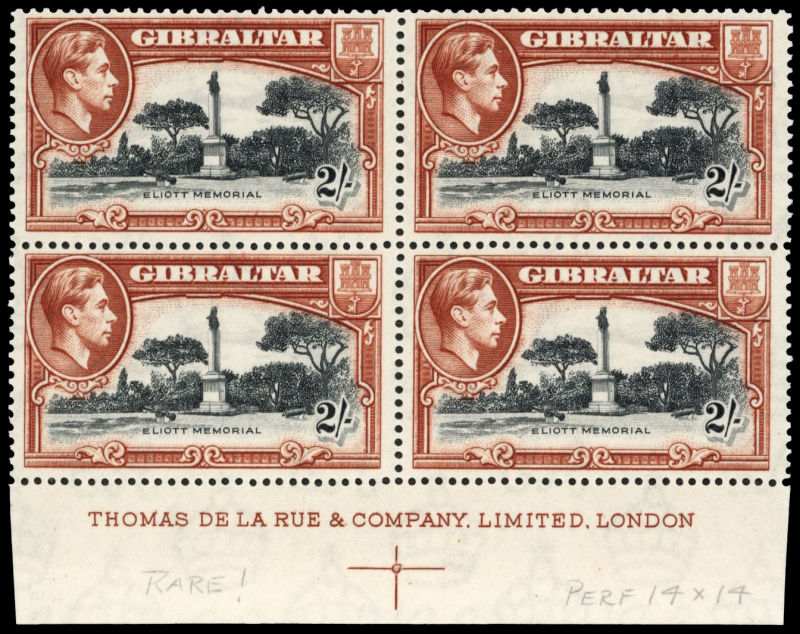 1938-42 2/- perf 13½ imprint block of four, fresh unmounted o.g., a little splitting at top otherwise fine. SG 128a, £520 (Image)