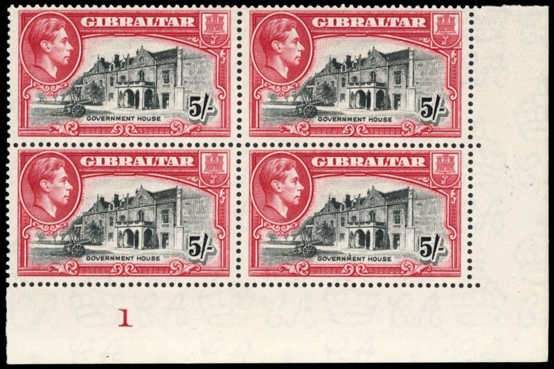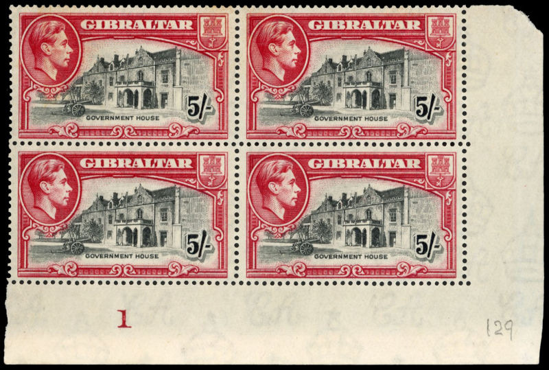 5/- perf 14 lower right corner block of four with Frame Plate 1, unmounted o.g. Right selvedge with a minor bend, R9/6 with a small natural ungummed area; scarce. SG 129, £440 (Image)