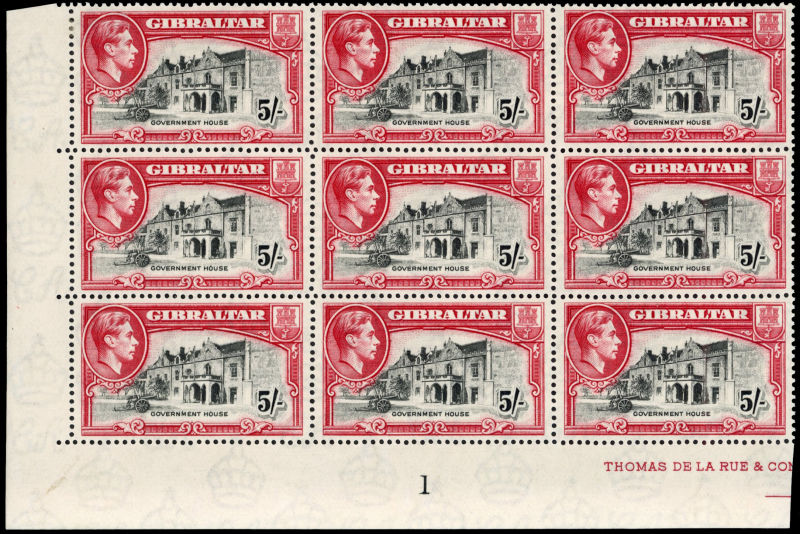 5/- perf 14 lower left corner block of nine with Vignette Plate 1 and part imprint, fine o.g., hinged on the top left and top right stamps only. SG 129, £990