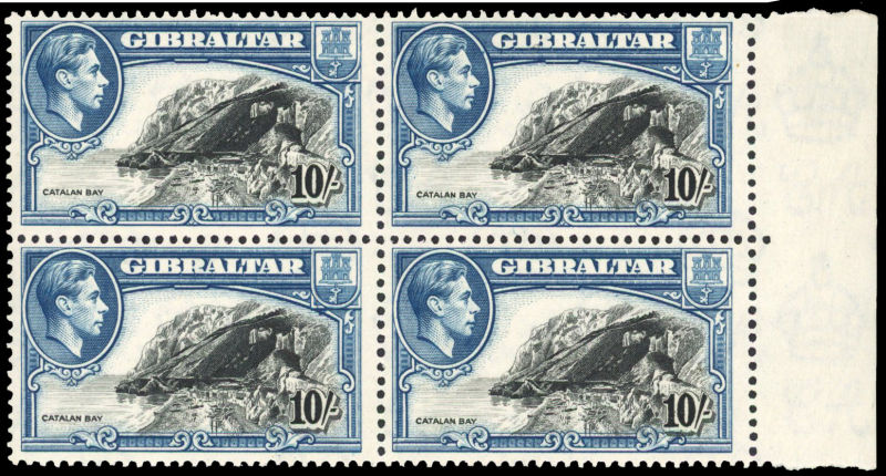 10/- black and blue perf 14, unmounted o.g. block of four with brown gum, as usual. Not an easy multiple. SG 130, £300 (Image)