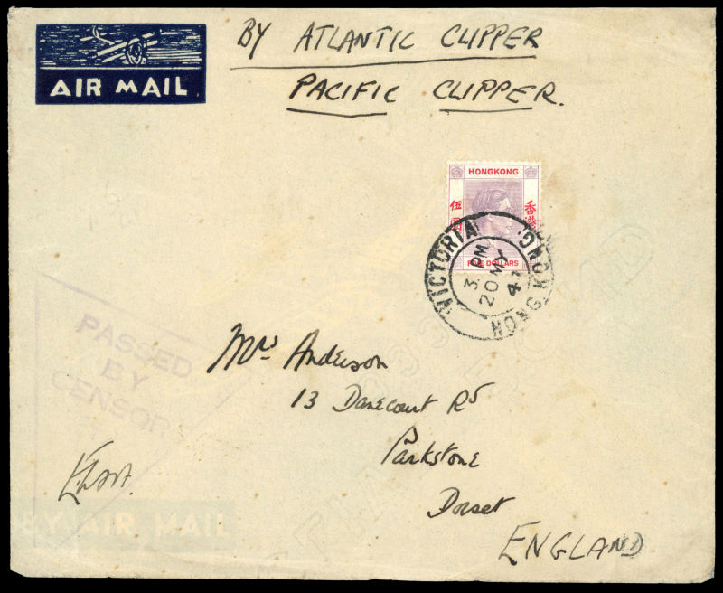 airmail envelope to Dorset bearing sole franking of $5 dull lilac and scarlet, Victoria CDS of 20 MY. Large (9rather faint) triangular Censor. Endorsed BY ATLANTIC CLIPPER/ PACIFIC CLIPPER. Slight wrinkling and ageing, but a good rate cover (Image) (Image2)