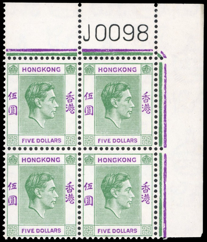 $5 yellowish green and violet on chalky paper top right corner block of four with Requisition J, o.g., hinged on the selvedge only with the stamps unmounted. Ex Jack Gee. SG 160ab, £440 (Image)