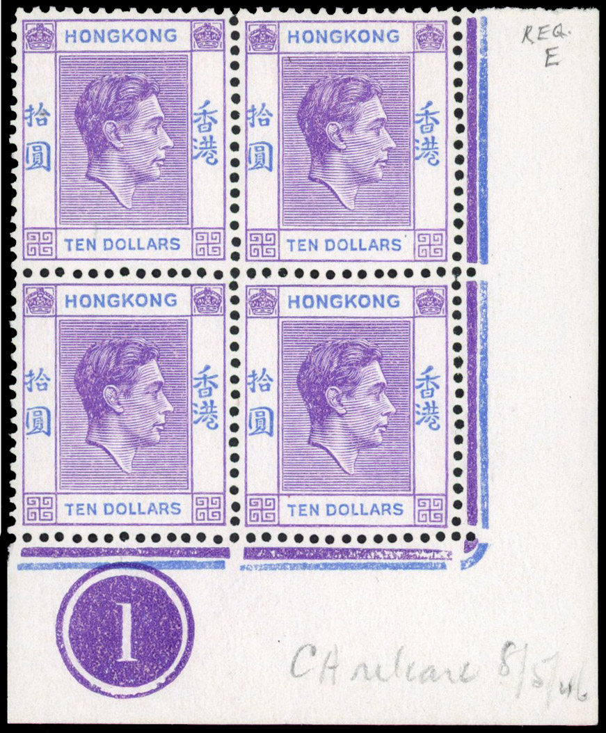 $10 pale bright lilac and blue lower right corner Plate 1 block of four, unmounted o.g. Contemporary annotation ‘CA release 8/5/46’ in pencil on selvedge. SG 162, £480