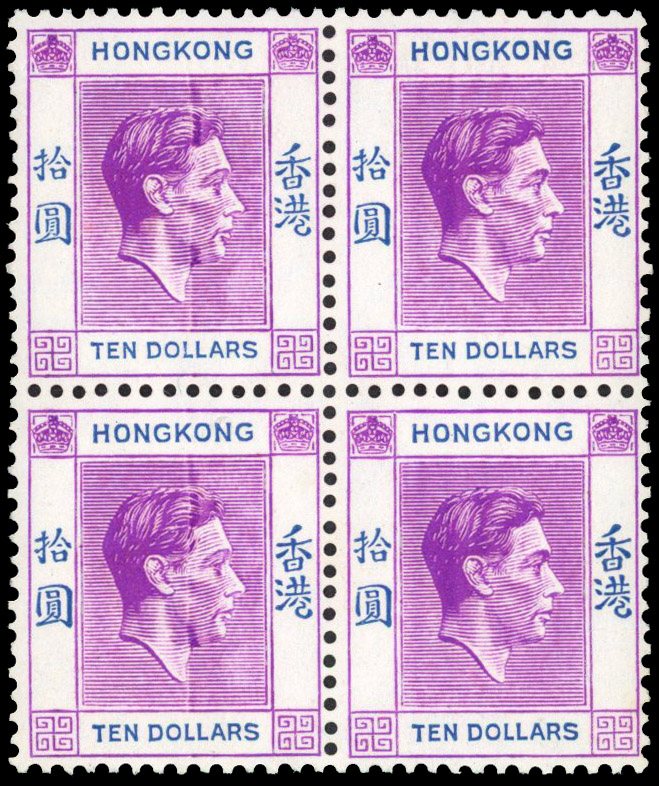 1947-51 $10 reddish violet and blue on chalky paper block of four, unmounted o.g. The left pair has an inking flaw (vertical white streak and violet puddling of ink), quite unusual. SG 162b var, £720+ (Image)