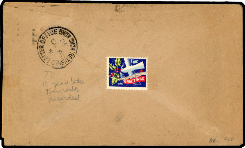 Postal History. 1950 envelope from London to Tsingtao, with two boxed Return to Sender markings and a Chinese label affixed to front, postmarked and with a further RETOUR handstamp. On reverse, a Christmas greetings label, and RETURNED
