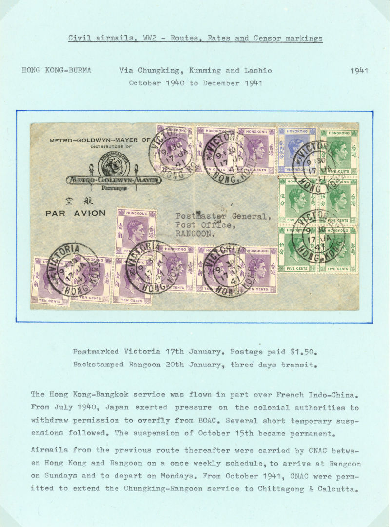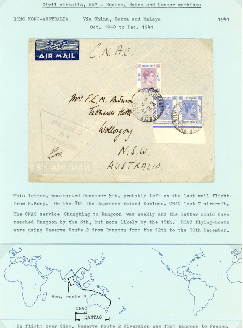 Postal History. 1941 airmail covers. 17 JA to Rangoon via Chungking, Kunming and Lashio, per CNAC; 5 DE to Australia (probably on the last mail flight before the invasion), triangular censor on face; FE 24 from France (20f50c rate) to
