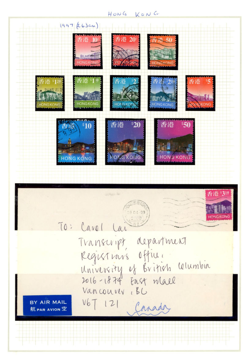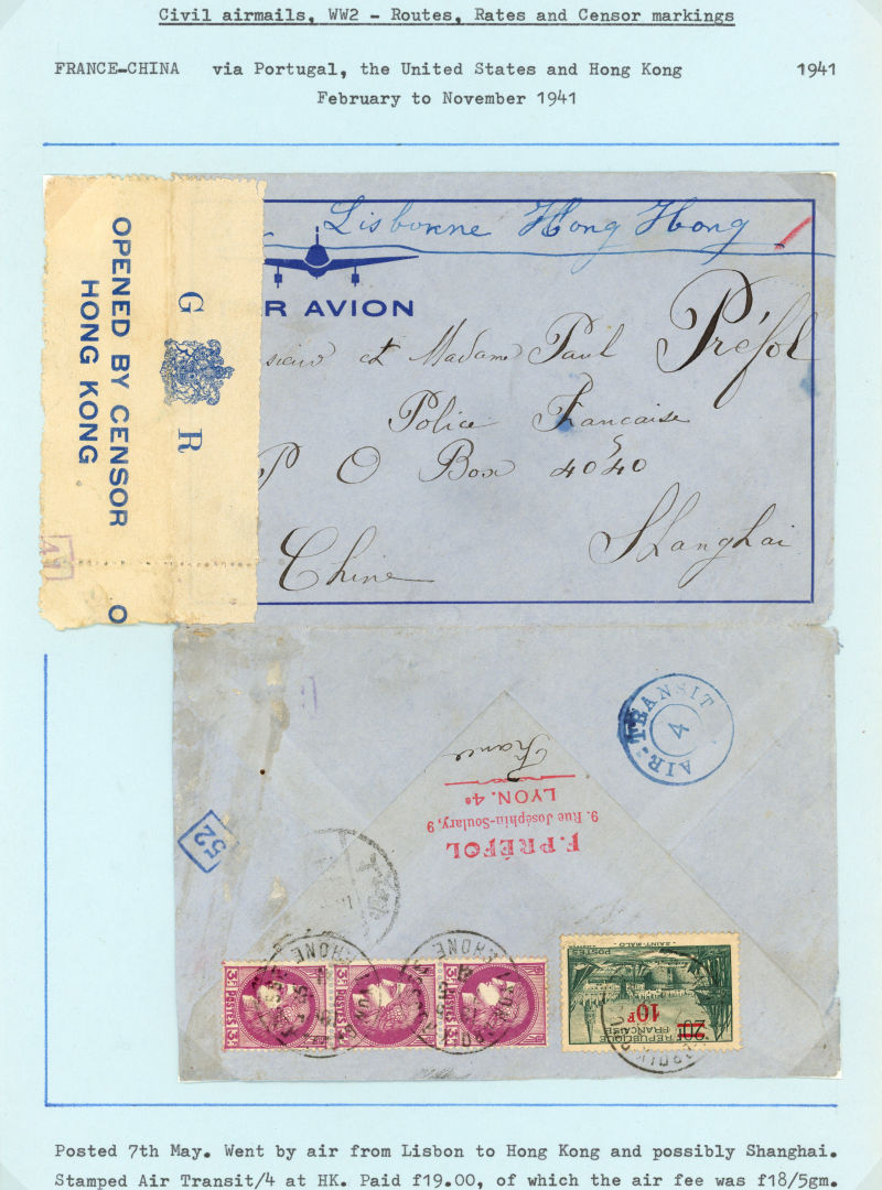 Shanghai, black HK Censor label and the rare AIR TRANSIT 2 mark in blue, applied in HK; 7 MY from France (19f rate) , opened out for display, blue HK Censor label and AIR TRANSIT 4 mark in blue. Ex Ian Warn (Image) (Image2)