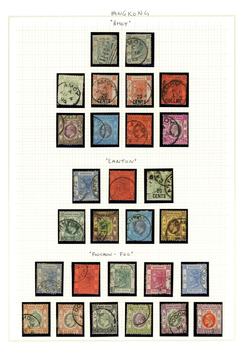 Accumulation from Queen Victoria to QEII in small carton with noted duplicated Treaty Port cancels with Foochow, Hankow Swatow, Tientsin and Liu Kung Tau, black and blue Y1 obliterators, ‘62B’ supplementary mail cancels with Wmk Crown CC 96c and $2
