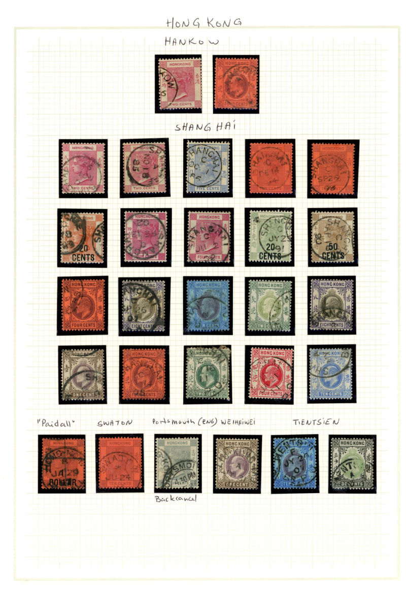 Postal fiscal, part I.P.O handstamps, other cancels including red Shanghai Br PO on pair 8c KEVII, some forged cancels included. (Many Hundreds)