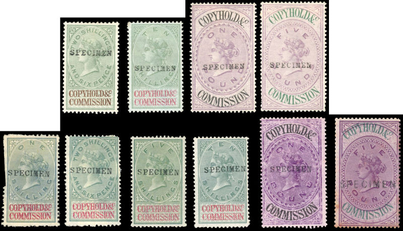 Copyhold & Co. Commission. Specimen group with 1881 watermark VR Script 2s6d, 10s, £1 and £5, handstamped Type GB9, fine but for hinge remainders; and an unlisted group, also handstamped Type GB9, in deeper colours, with 1s, 2s6d, 5s and