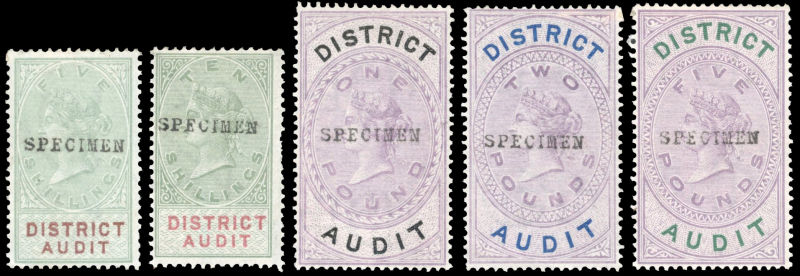 District Audit. 1882 set of five handstamped SPECIMEN Type GB9, o.g. The 5s overprinted in brown (see note in Booth). Some minor wrinkles and the 10s with damaged perfs at right, otherwise fine. Booth 6-10 (Image)