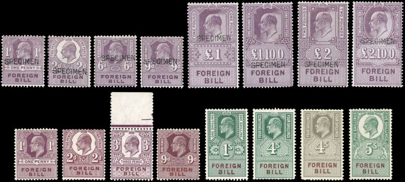 Bill. 1902 values, o.g. SPECIMEN Type GB16 handstamps, the stamps all reddish lilac overprinted in deep dull purple; 1d, 2d, 6d, 9d, £1, £1 10s, £2 (short perfs at right) and £2 10s; issued stamps (markedly different colours) overprinted in
