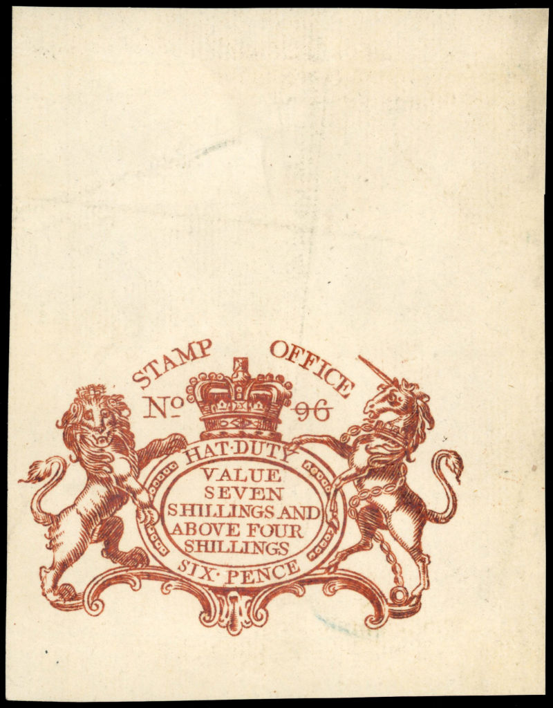 Tax. 1803 6d chestnut (for hats VALUE SEVEN SHILLINGS AND ABOVE FOUR SHILLINGS) proof impression on thick laid paper of Plate 43 position 96, clear impression with margins good to huge, fine and attractive. Very rare. Booth Type 51-2B (Image)