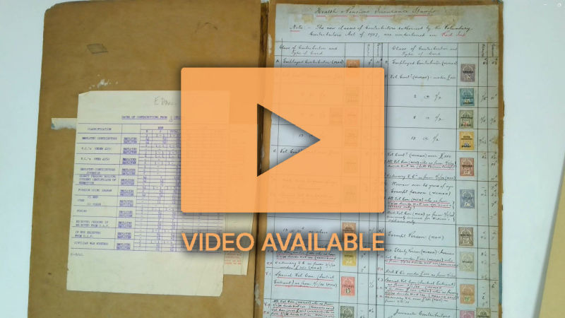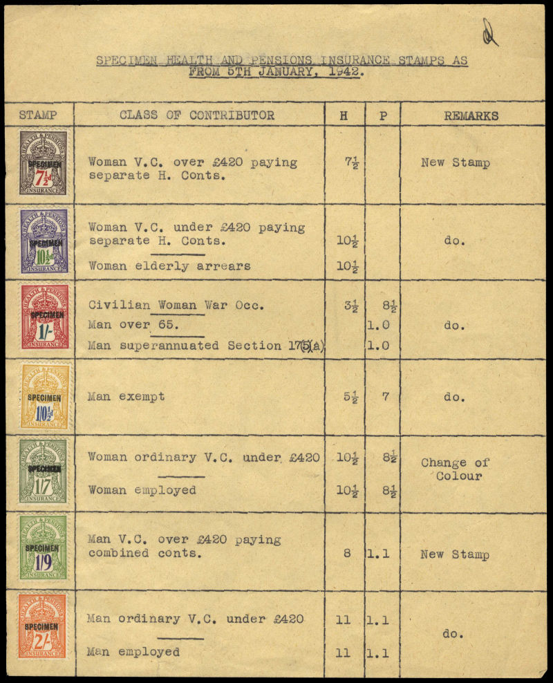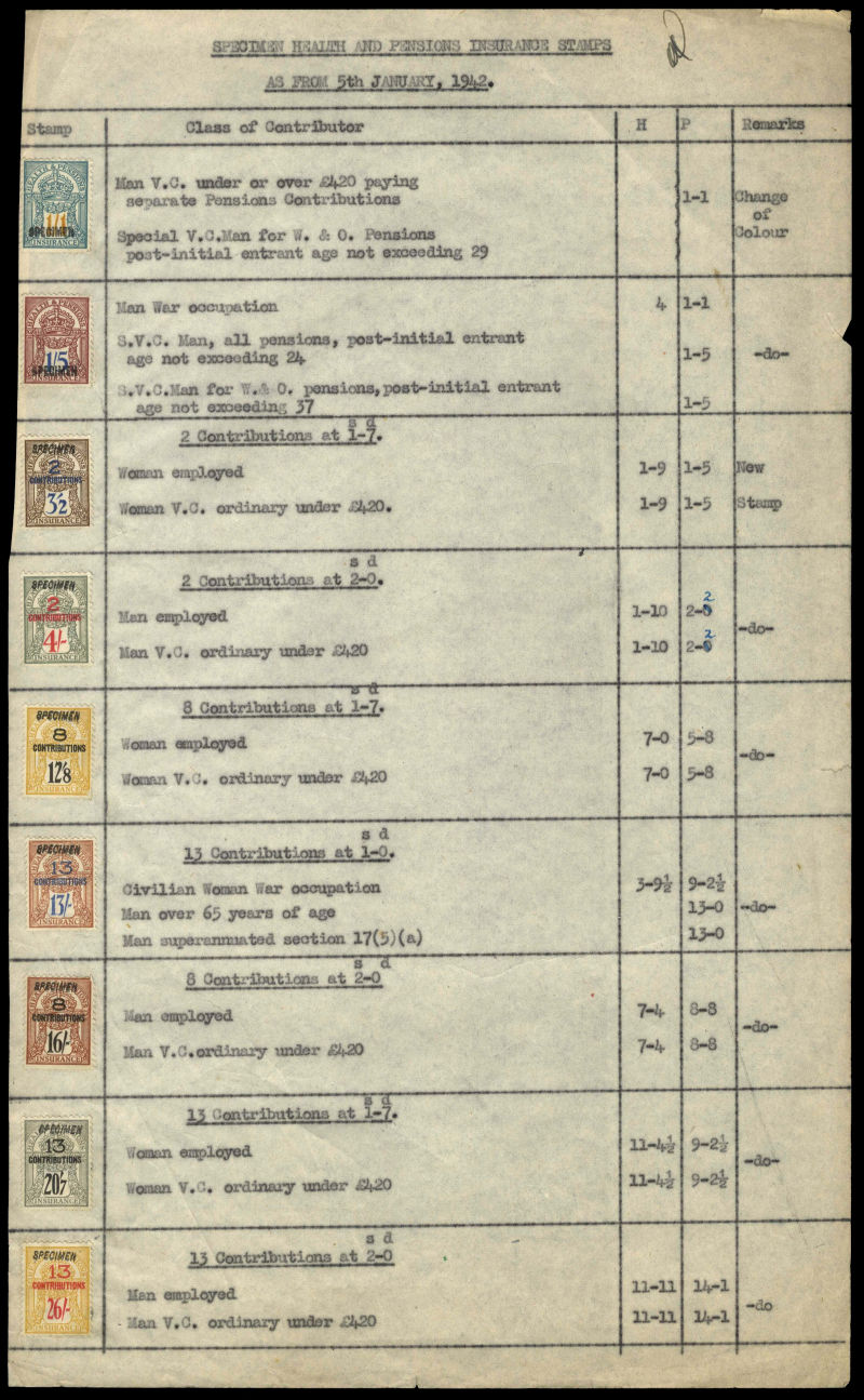 and Pensions Insurance. January 1942 new stamps affixed to two typed sheets, which give a description of the classes of contributor liable to pay the stamp rate; sixteen values from 7½d to 26/-, each overprinted SPECIMEN, either in block or italic