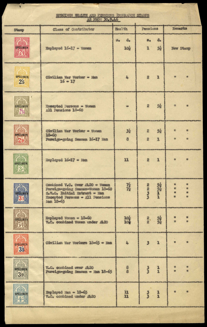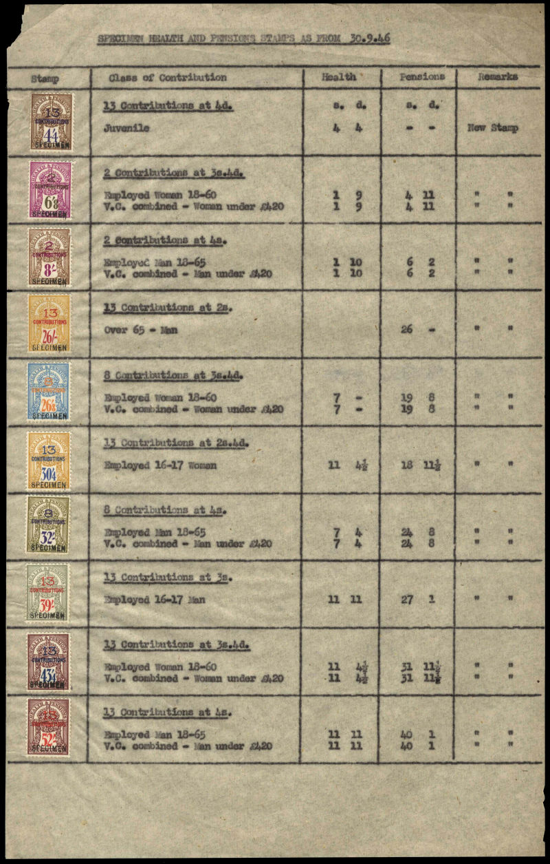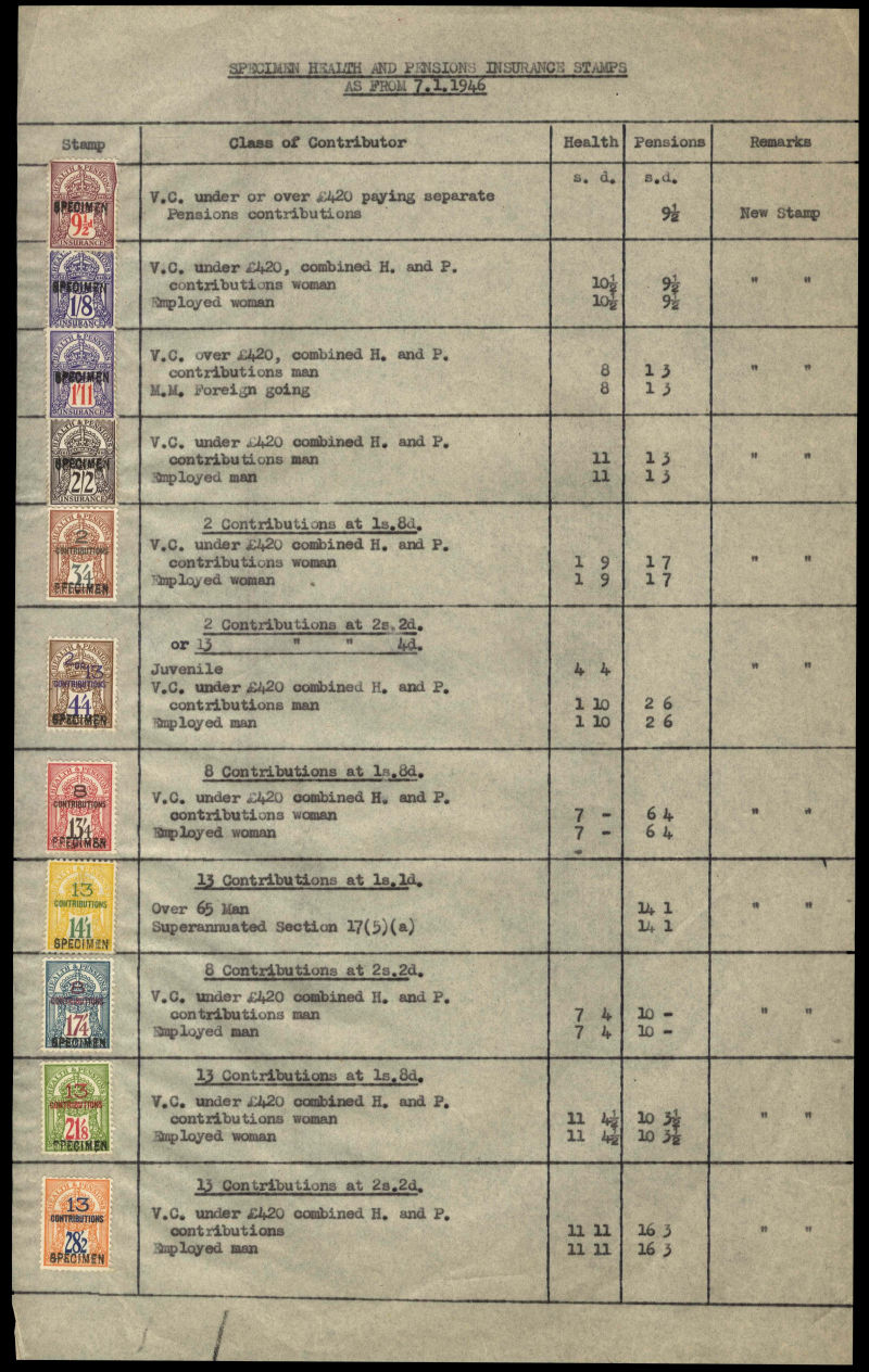and Pensions Insurance. January 1946 new stamps affixed to a typed sheet, which gives a description of the classes of contributor liable to pay the stamp rate; eleven values from 9½d to 28/2d, each overprinted SPECIMEN. Includes seven for multiple
