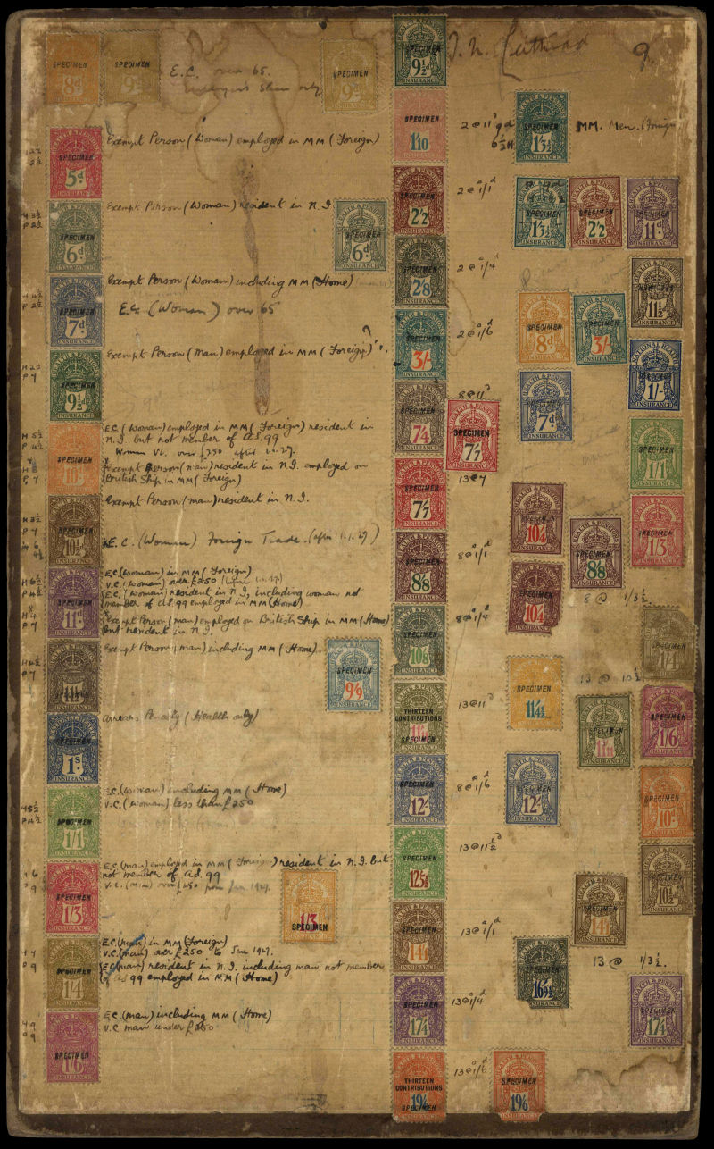 and Pensions Insurance. C1938 new stamps (24), all Specimens, values from 4d to 21/8d, affixed to a piece of paper on the inside of a worn heavy board folder, presumably used for day-to-day reference in a working office. The annotations as to who