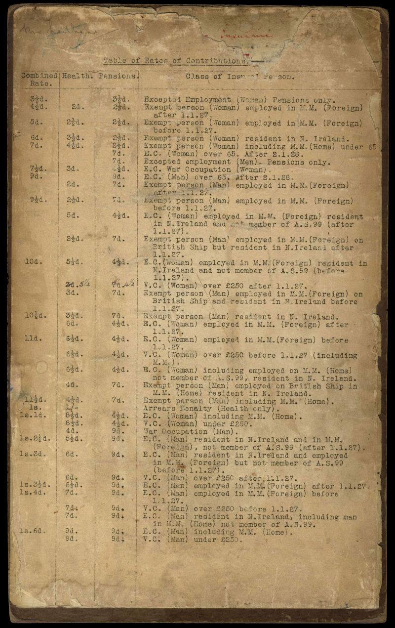 and Pensions Insurance. July 1940 new stamps affixed to a typed sheet, which gives a description of the classes of contributor liable to pay the stamp rate; seven values from 4d to 1/10d, each overprinted italic SPECIMEN. One value damaged, the
