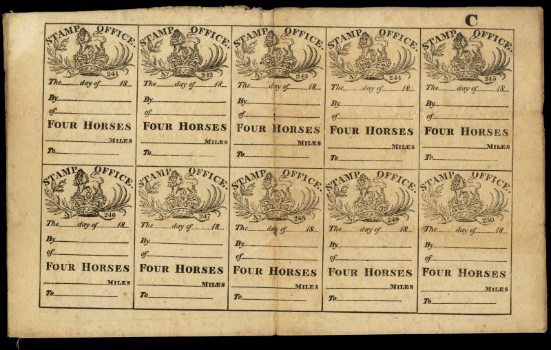 Horse Duty. 1826 sheet of ten mileage tickets for four horses in black. Full margins, with the letter ‘C’ above the upper right stamp. Central vertical fold and some peripheral wear, unsurprising for an item about to celebrate its 200th birthday.