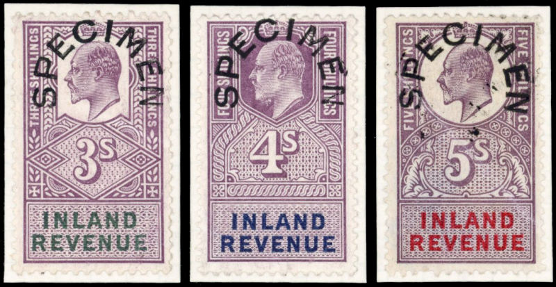 Revenue. 1904 KEVII 3s, 4s and 5s trio overprinted SPECIMEN Type GB17, each affixed to piece. The 5s with a little stray ink on face, and inconspicuously creased (before application to the piece). Rare. Booth 47-9 (Image)