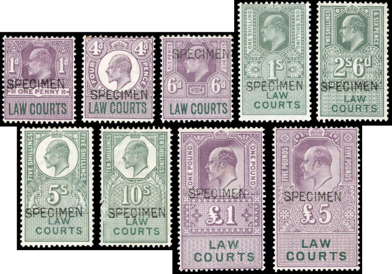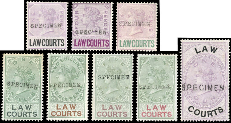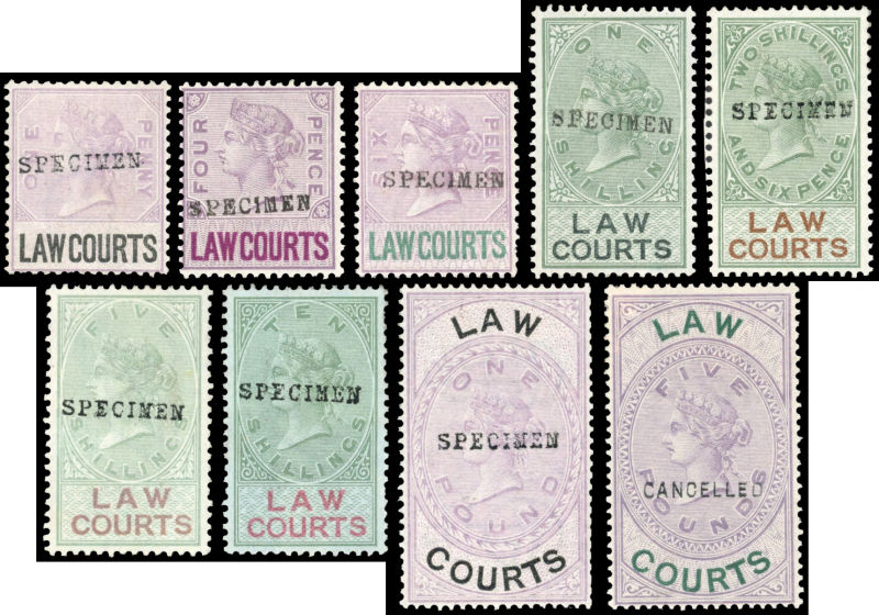 Courts (Scotland). 1882 set, all known values less the £5, each overprinted SPECIMEN Type GB9 save the £1 (Type GB 11). Some gum adhesions, the 3d without gum; scarce group. Booth 16-19, 22-5 (Image)
