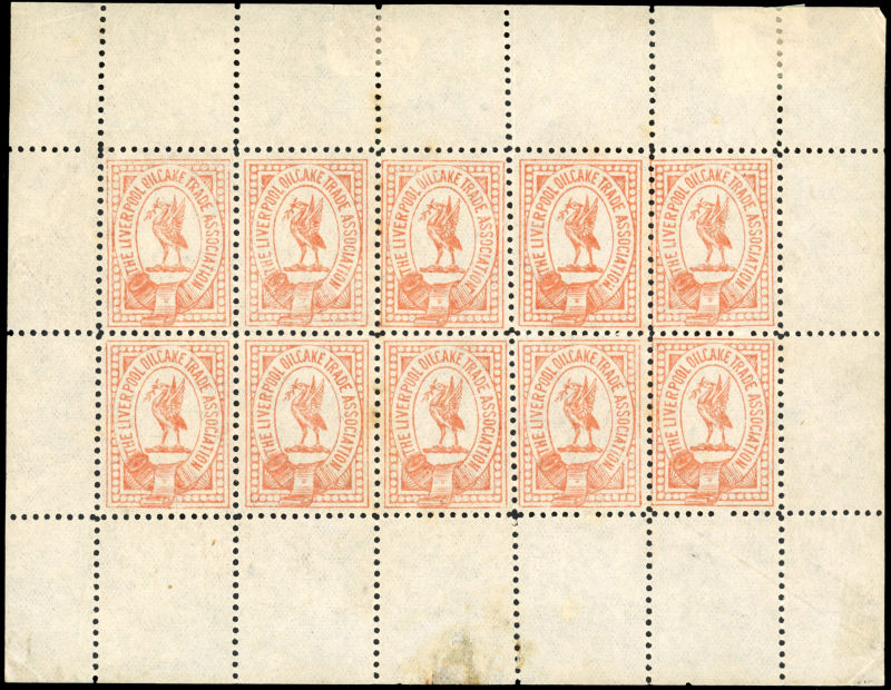 Liverpool Oil Cake Trade Association. Undenominated stamp in pale vermilion sheet of ten, perf 11 with margins all round, some faults (reinforced at top, splitting at left, some foxing on reverse) but an extremely rare sheet, the only