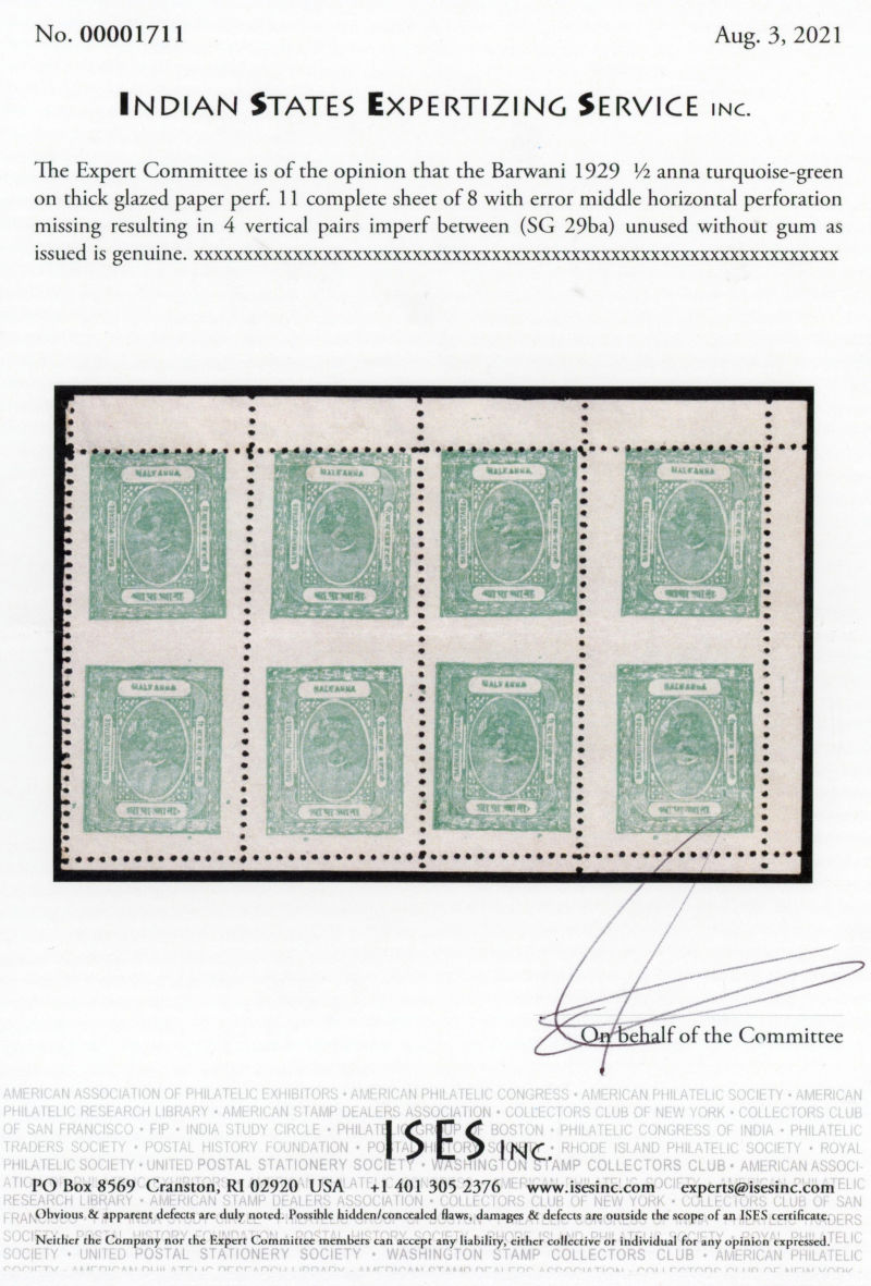 I.F.S. Barwani SG 29ba 1928 ½a sheet with four imp
