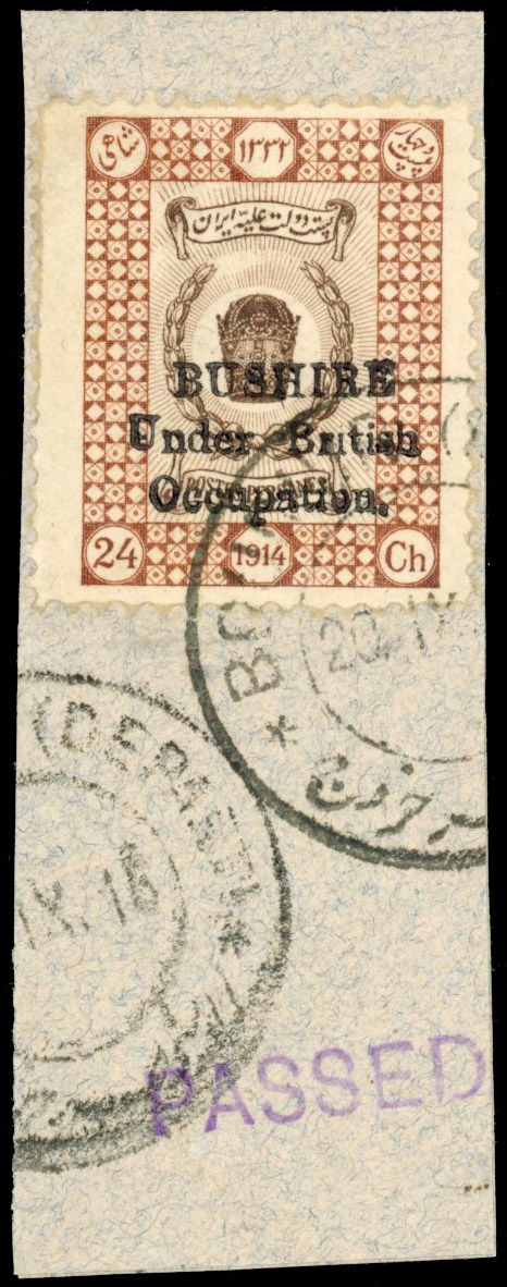 Bushire SG 23 1915 Coronation 24ch used on piece