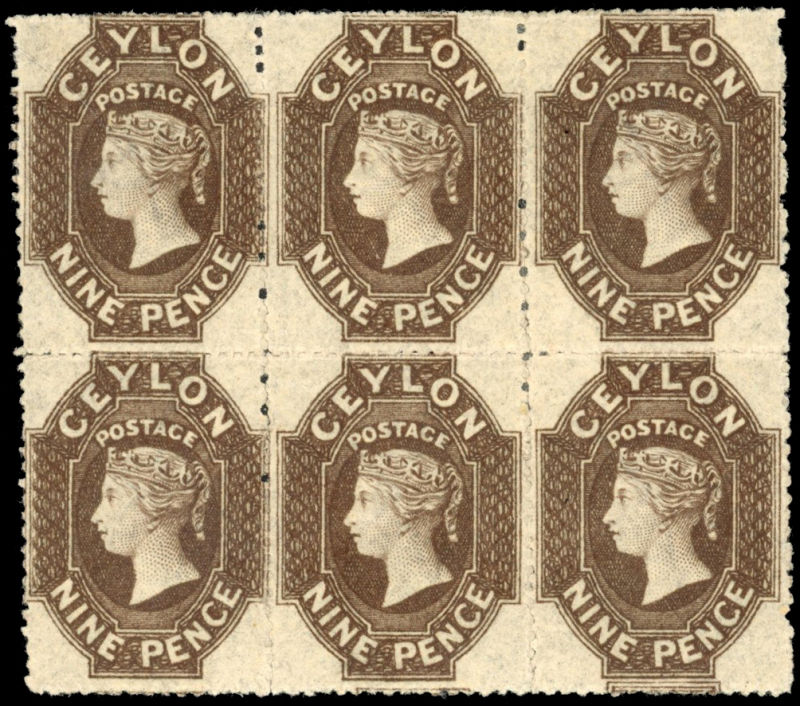 Ceylon SG 33 1861-4 9d rough perf block of six min