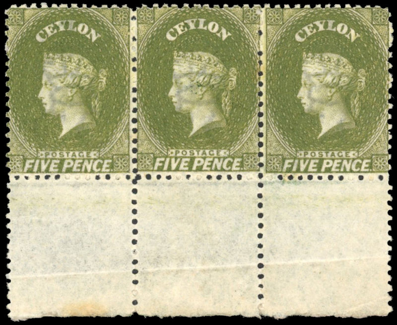 Ceylon SG 66b 1869 5d olive-green strip of three m