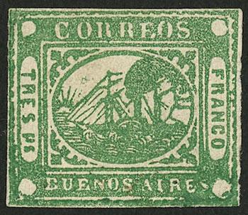 PHILATELIC GEM: GJ.6, Tres Ps. green, mint, wide and complete margins, fresh, perfect in every way, one of the few perfect examples in existence and one of the most beautiful! It is the stamp used by Kneitschel in his reconstruction of the plate, at position 41. NOTE: At the buyer's request, we can provide a certificate of authenticity.....