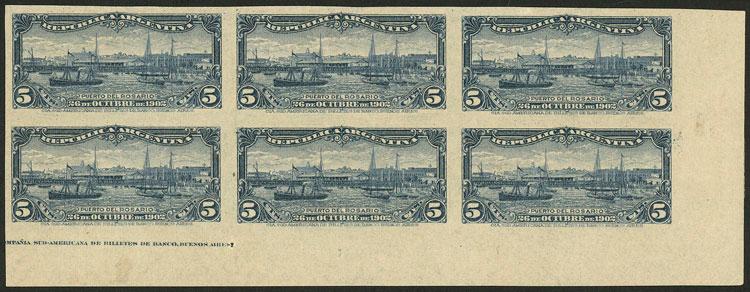 GJ.273P, 1902 Port of Rosario, IMPERFORATE corner block of 6, largest known multiple of this variety, excellent quality!....