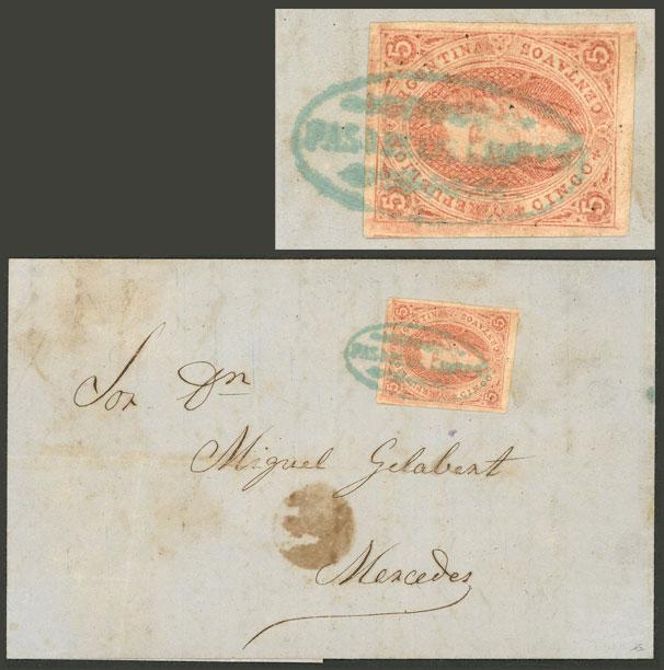 GJ.27A, 6th printing imperforate, orangish dun-red, fantastic example of huge margins and very fresh, franking a folded cover sent from PASO DE LOS LIBRES to Mercedes, excellent quality! With Alberto Solari certificate....