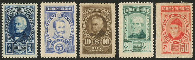 GJ.115/119, 1889 Sudamericana issue, the 5 high values of the set including the 2 unissued values of 10P. and 50P. signed by Victor Kneitschel on back, rare lot, VF quality!....