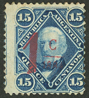 1884 provisional 4 on 5c. Rivadavia, with the "4" hand-written in pen, excellent quality, very rare and under-valued in the catalog, signed by Victor Kneitschel on back!