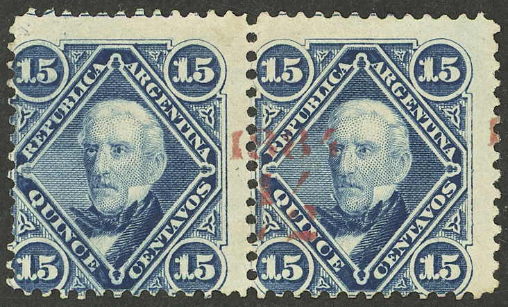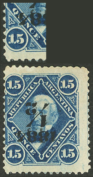 1884 provisional ½c on 15c. with background of crossed lines, carmine overprint, pair WITH AND WITHOUT OVERPRINT, excellent quality, extremely rare! (Image)