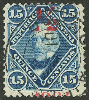 1884 provisional ½c on 15c. with background of crossed lines, shifted carmine overprint ("½" at top), used, excellent quality, extremely rare and under-valued in the catalog! Signed by Kneitschel on back. (Image)