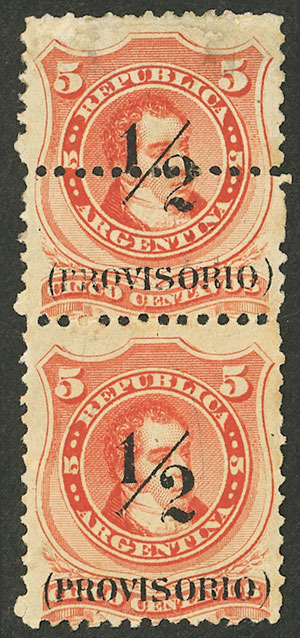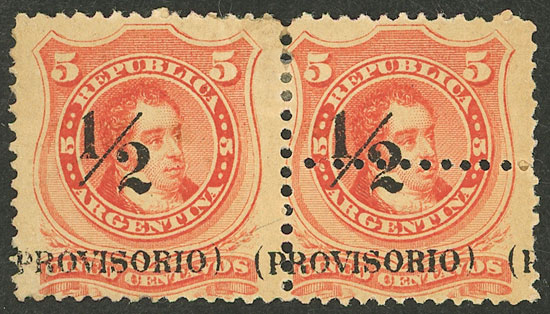 1882 ½c. provisional, pair WITH AND WITHOUT PERFORATION ACROSS THE MIDDLE, excellent quality, rare! (Image)