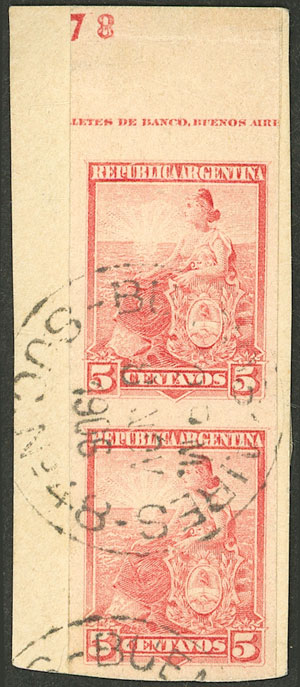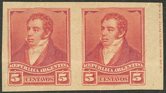 1892 5c. Rivadavia, IMPERFORATE PAIR, very fine quality! (Image)