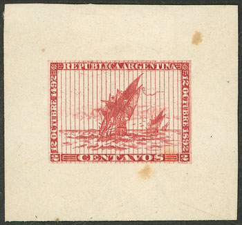 1892 2c. Discovery of America, die essay in carmine, unadopted design with vertical lines, rare! (Image)