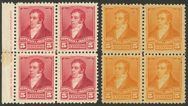 1892 5c. Rivadavia, COLOR PROOFS (orange and carmine), perforated blocks of 4 printed on normal paper, the former with gum, very fine quality, rare! (Image)