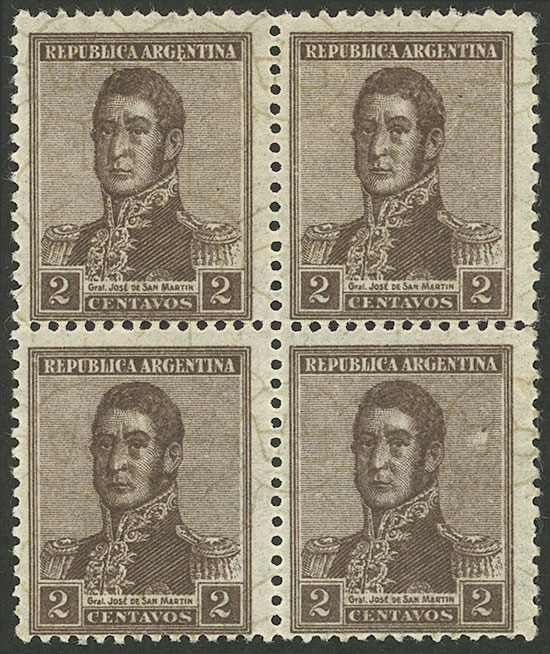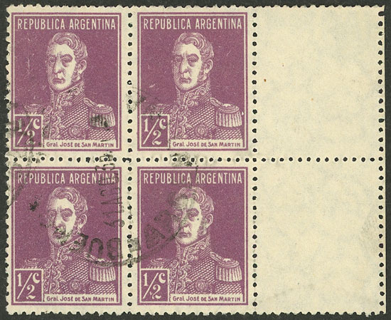 1924 ½c. San Martín, block of 4 WITH RIGHT LABELS, used, excellent quality, very rare! (it is almost impossible to find these stamps with labels in used condition, and much more in a block!) (Image)