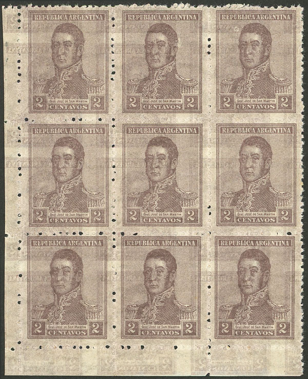 1917 2c. San Martín with DOUBLE IMPRESSION variety, fantastic MNH block of 9 (+50%), superb and spectacular! (Image)