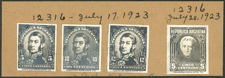 photographic designs presented in 1923 by the American Bank Note Co. to the postal authorities: 5c, 10c and 12c, San Martín, and 5c. Saavedra, extremely rare!