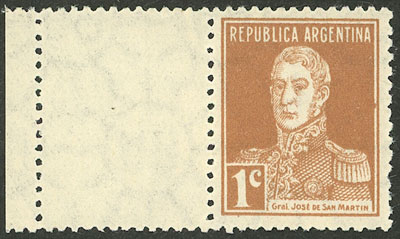 (GJ.595CZ), 1924 1c. San Martín WITH LEFT LABEL, very fine quality, not yet catalogued (it will be included in the next edition of the GJ catalog)