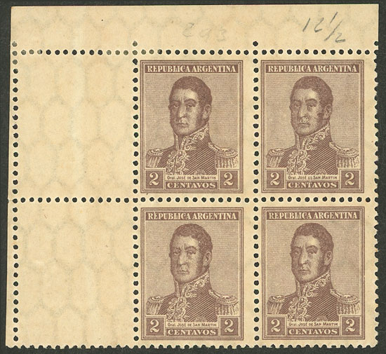 1917 2c. San Martín with vertical honeycomb watermark and perforation 13½ x 12½, block of 4 WITH LEFT LABELS, excellent quality, rare! NOTE: It will be included in the next edition of the GJ catalog. (Image)