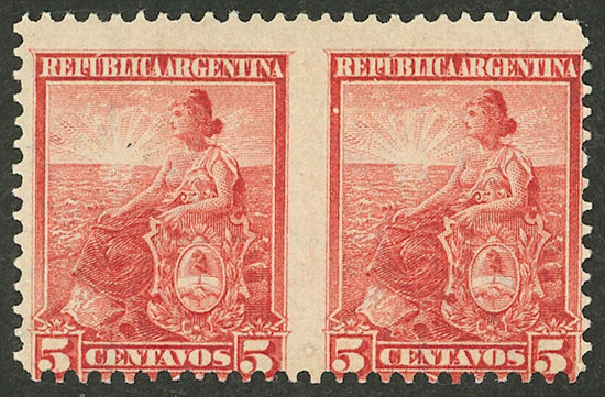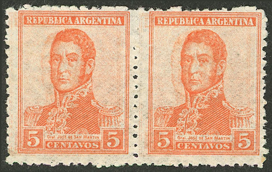 (GJ.498a), 1920 5c. San Martín with multiple suns watermark and perf 13½x12½, pair with DOUBLE IMPRESSION variety. Not yet catalogued, it will be included in the next edition of the GJ catalog, VF quality! (Image)