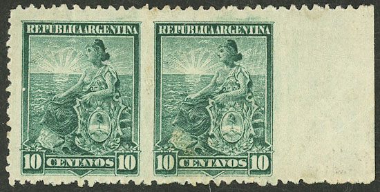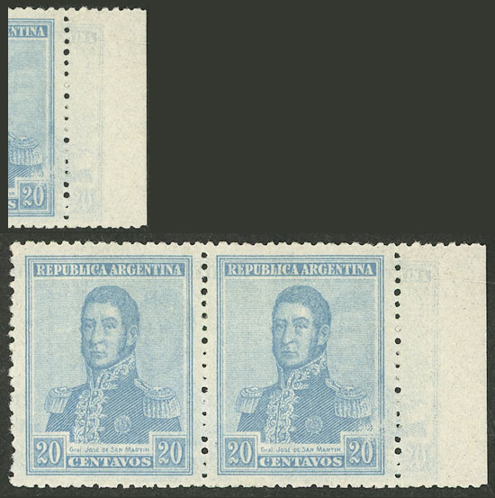 1917 20c. San Martín without watermark, pair with DOUBLE IMPRESSION (one faint), excellent quality! (Image)